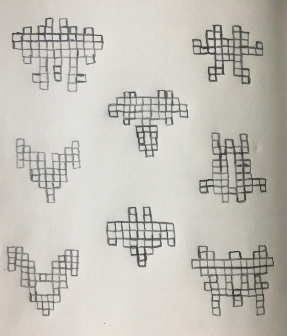 I decided to move away from the Galaga ships and create my own designs because I felt it would become more unique. I sketched out some different variations in cubic form until I found one that I was happy with.