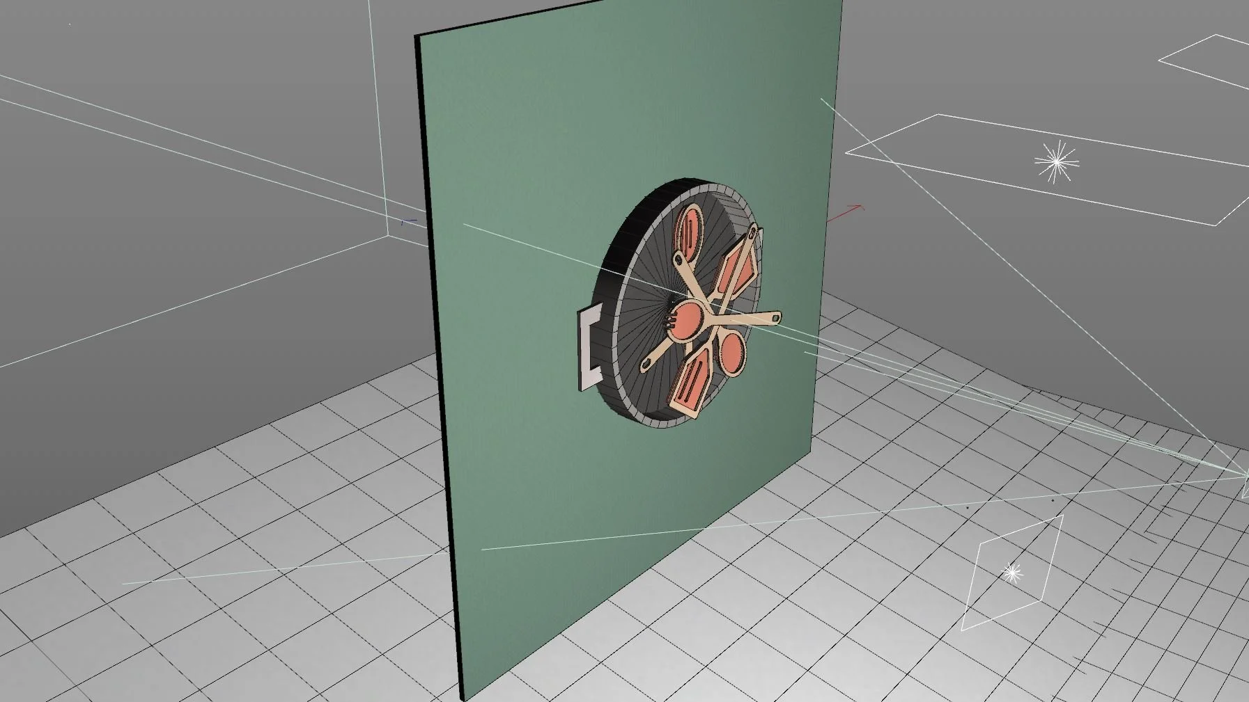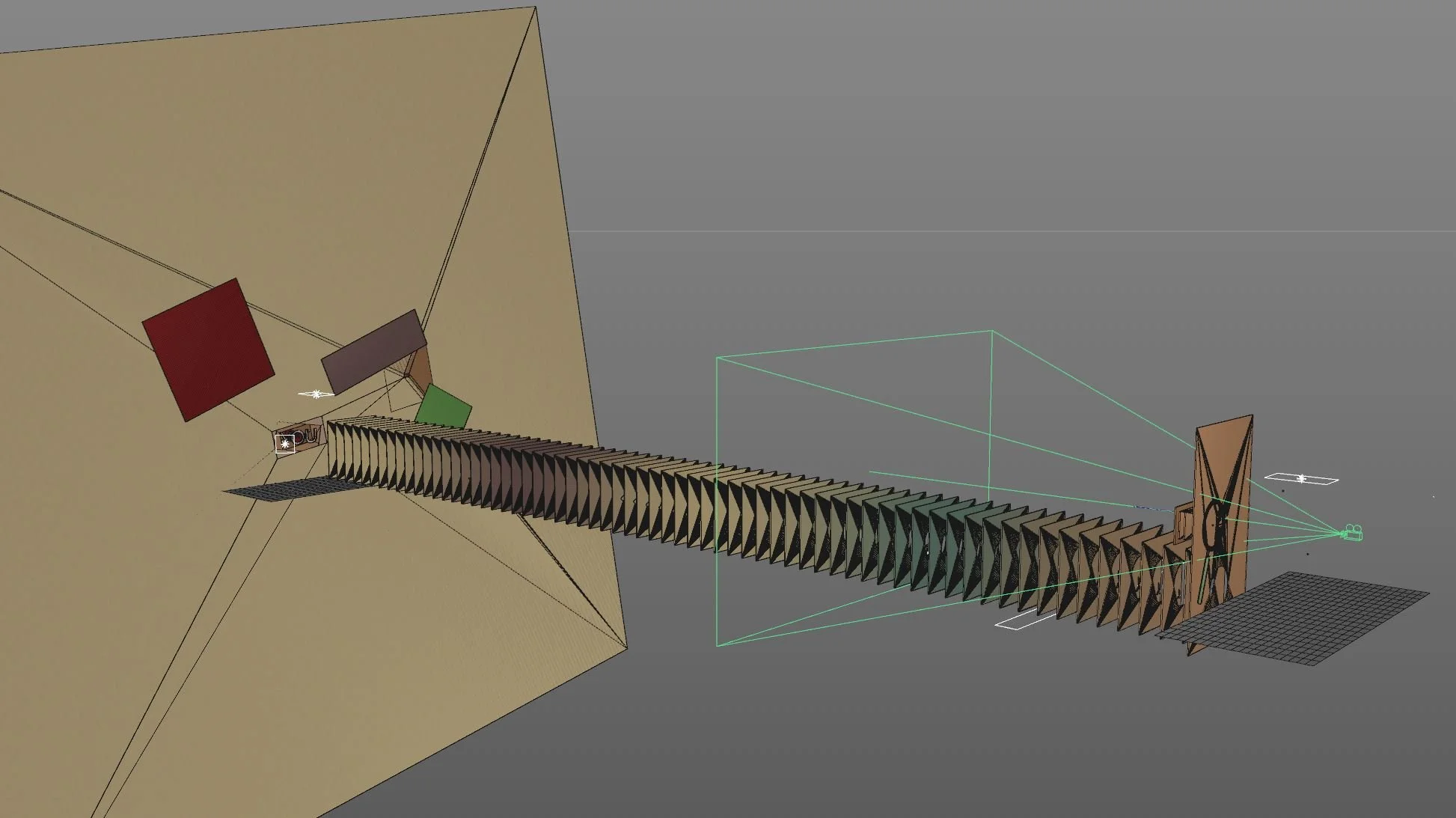 The lighting for this particular piece is very simple. At first I worked to create a three point lighting system, but found that the lighting became too complicated for the flat objects that I was using. We found that just using a single light was plenty of light information for each scene. A plane was added with a white diffuse texture, in order to create bounce light.